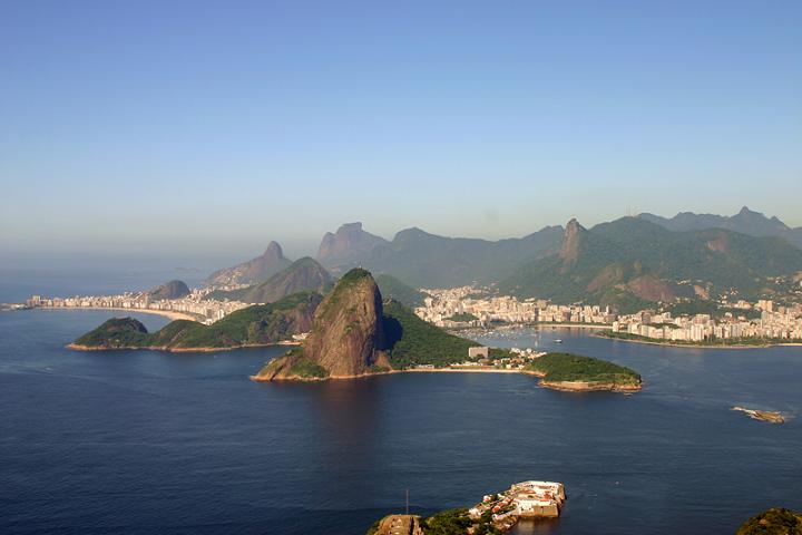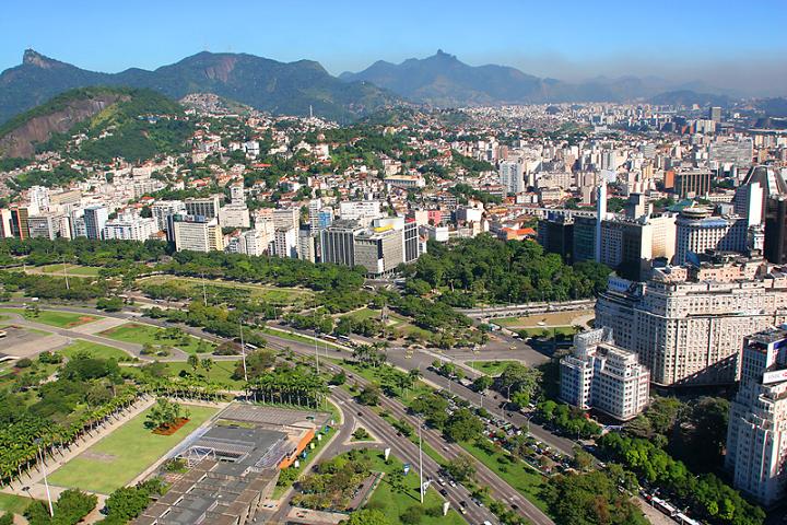 This aerial view shows the southern part of our downtown, exactly where begins the South Zone [beach neighborhoods] of Rio de Janeiro, yet inside Guanabara Bay, with the district of Glória [at left of the picture, middleground] and Santa Teresa [in the hills, at left background]. At left foreground you can see the roof of our Museum of Modern Art [inaugurated in 1967] in the Flamengo Park, with all gardens created by Burle Marx. This park is in a landfill, conquesting from Guanabar Bay more space for this metropolis. A curiosity, partly good, partly bad: at right foreground of the picture you can see North Zone, where my parents and I live, very close to the mountains, at a relatively short distance from Downtown and South Zone, but unfortunely too close enough to feel a taste of their smog [see the creepy brown color of the atmosphere].