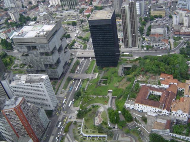 A detail with PETROBRÁS Building [at left of the picture], with surface and suspended gardens [note voids with plants in the facade, a very interesting feature because works can stroll when very stressed with office work], everything created by Burle Marx around 1972. This building is the headquarters of Brazilian federal company of petrol exploration and distribution, and maybe you could remember a building created by marciozhugo, a Brazilian bapper, with this building as inspiration for a Freeland Company. At right foreground of the picture you can see Avenida Chile, with calceteria work on their sidewalks [note black and white pattern of the sidewalks]. At foreground and left you see the rooftop of Santa Teresa Streetcar Staion : you already saw images of old neighborhood of Santa Teresa [On Page 1], and here is the place where you can take bondes [those yellow streetcars] - their rails are clearly visible in the picture.