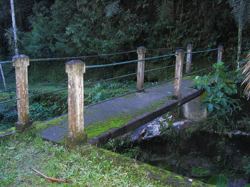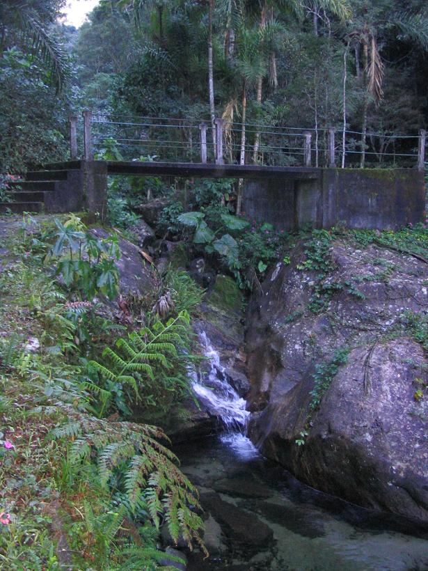 I promised in 2006 to show buildings from old railway days or from more recent activities that are now surrounded by Brazilian rain forest. Here you see a XXth Century bridge for pedestrians to reach an old water barrage, next message will show better this bridge, but here you can imagine how hard is to find a good angle to show anything in the woods. I liked this view due to this little river with fallings and lovely plants and flowers so close to the bridge itself.