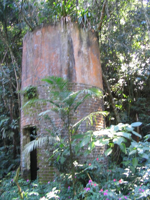 The railway doesn't exist anymore, but many structures still resist because they were very well done. For example, see bellow this water tower, with two floors height [the door at first floor appears at bottom left], built in 1909, entirely with stone and a cylindrical shape. It appears on a jungle walkway because trees occupied again the soil where once a time the rails were and looks like a medieval tower. We're trying to make a "touristic trail" using structures like this as an atractive way to know both Nature and History.