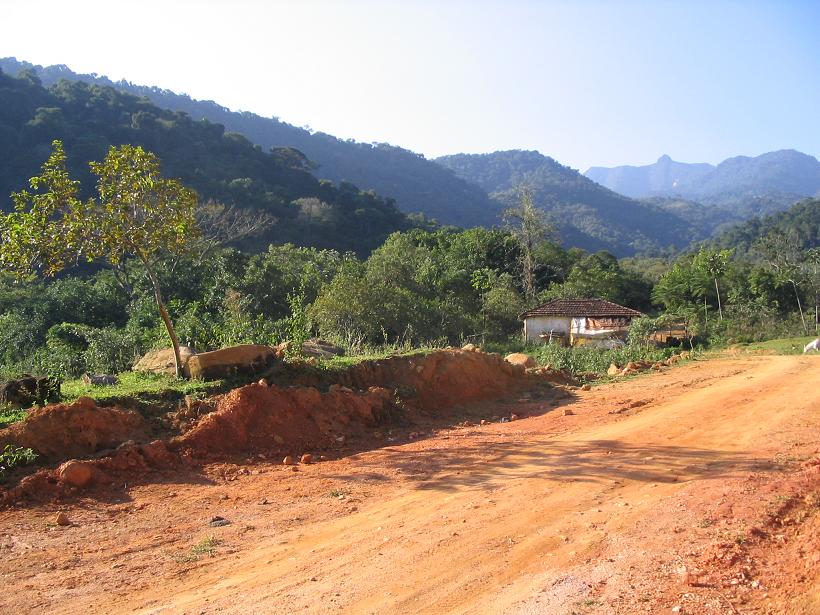 Below is an old farm, occupied by a family of modest income, in Cachoeiras de Macacu, one of five municipalities where PETP is situated. This farm is in the limits of this park and has a relatively small cultivated area. Note in foreground a gravel road with a work under way: it's for a water pipeline from a neighbooring farm; its owner will pump mineral water to be sold in Rio de Janeiro, where there is a good market for "natural fresh water from the mountains" [and this water is really good, I can say that because I'm a satisfied consumer!]. This view is improved with a nice view from the mountains in background. It was a sunny winter day, time to have pictures because in winter there are fewer rains than in summer, but it wasn't hot then [and at night you feel cold, with almos 10 degrees centigrades, for a carioca this is almost like a night at the North Pole!]. Hope you enjoy.